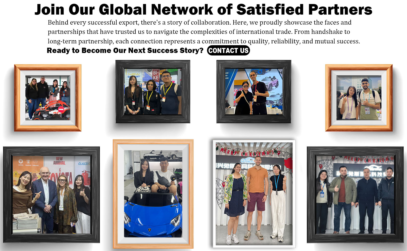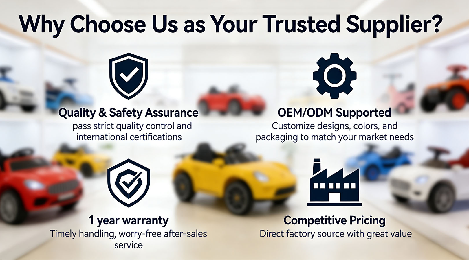 Au fil des décennies, Tusi Toys est devenu un excellent fournisseur et exportateur de produits pour bébés en Chine au cours des 12 dernières années. notre gamme de produits couvre différents types de véhicules électriques pour enfants, notamment les voitures électriques, les motos électriques, les poussettes électriques et d'autres séries, conçues pour répondre aux différents besoins des enfants d'âges différents. Nous contrôlons strictement la qualité de chaque maillon depuis la sélection des produits, la supervision de la production jusqu'à l'inspection avant livraison, en nous conformant aux certifications internationales de qualité et de sécurité telles que CE, EN71, ASTM F963, pour garantir que chaque produit qui quitte l'usine est sûr, durable et respectueux de l'environnement.